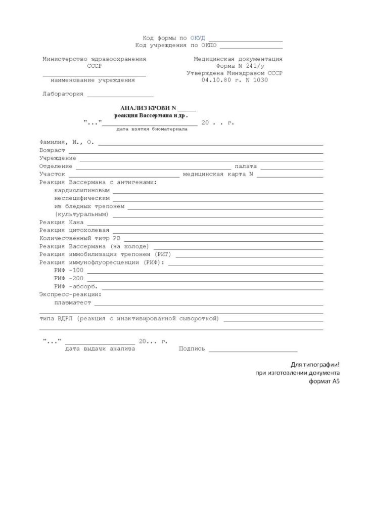 После проведения анализа пациент получает на руки официальное заключение формы 241/у, справка оформляется на бланке установленного образца, заверяется подписями и печатями. Сдача анализа может проводиться по различным причинам, одной из них является прохождение медицинской комиссии при трудоустройстве.