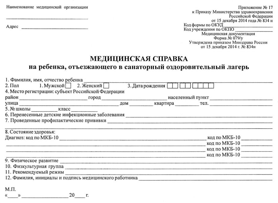 Для несовершеннолетнего, который направляется в лагерь, обязательно требуется предоставление такой бумаги вместе с прочими документами. Выдавать её могут только опытные и квалифицированные специалисты. Главная задача при этом заключается в указании всех необходимых сведений о состоянии здоровья и имеющихся заболеваний у каждого прибывающего ребёнка в оздоровительное учреждение.