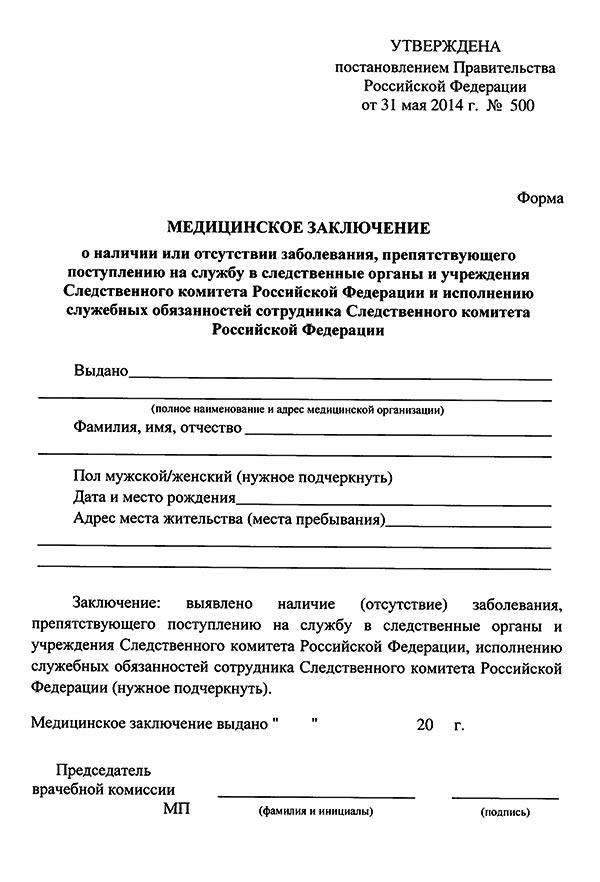 Работа в правоохранительных и следственных структурах предполагает оказание на сотрудника постоянных и повышенных физических и психических нагрузок. Поэтому к вопросу подбора таких сотрудников важно подходить с особенным вниманием, они должны в полной мере соответствовать требованиям в отношении состояния физического здоровья и психики. На основании Постановления Правительства РФ № 500 к такой работе допускаются только те лица, которые не имеют пристрастия к спиртному или наркотикам, у них отсутствуют расстройства психики, а также умственная отсталость, неврологические заболевания, эпилепсия и туберкулёз.
